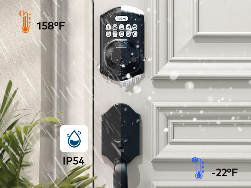 This keypad lock is IP54 waterproof and operates well in temperatures from -22 °F to 158 °F, keeping your home safe in all kinds of climates, including cold winters, hot summers or rainy days.