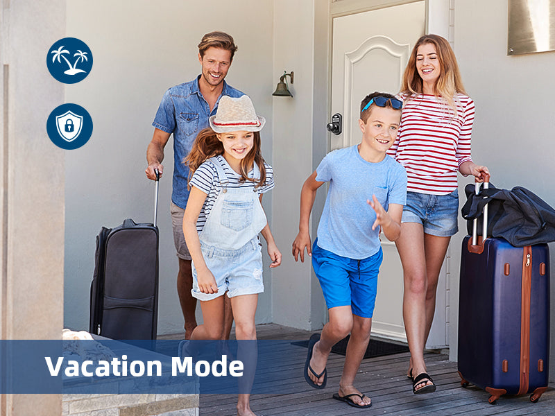 The vacation mode puts the system into a low power state, disabling all buttons and functions until master code is entered on keypad. If the door knob is unlocked by thumb turn, the keypad door lock will issue an alert.