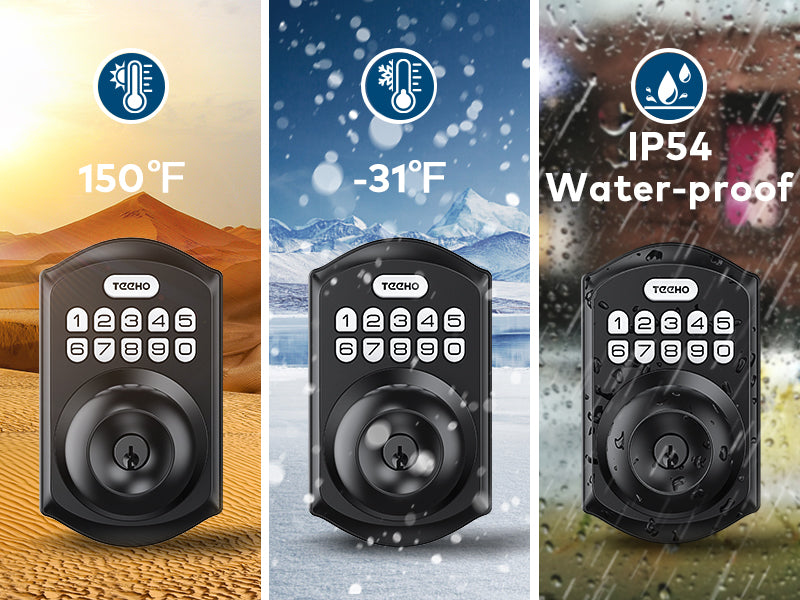TEEHO deadbolt smart lock is IP54 waterproof and operates well in temperatures from -31 °F to 150 °F, keeping your home safe regardless of rainning, sunshine, snow or hail.
