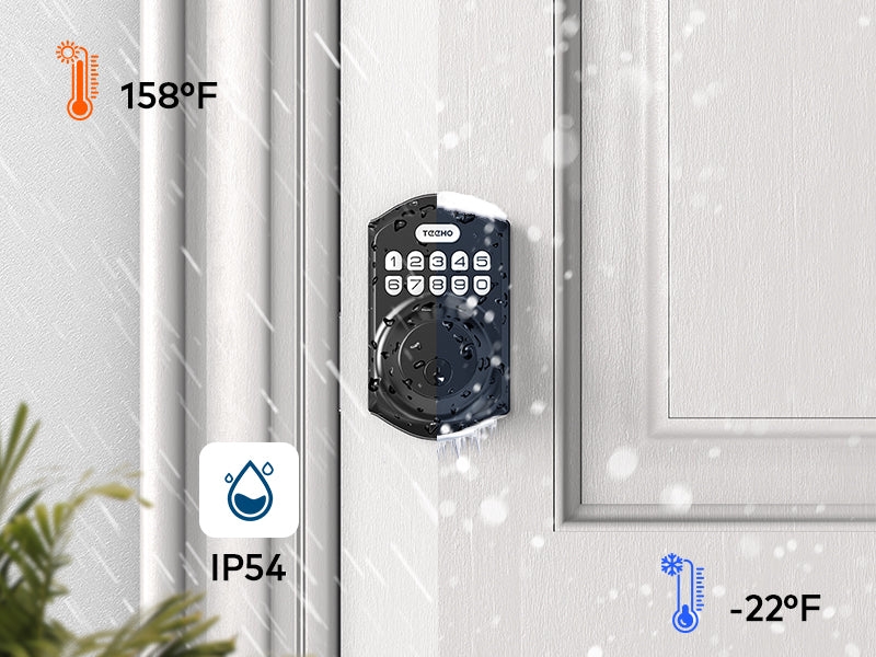 This keypad lock is IP54 waterproof and operates well in temperatures from -22 °F to 158 °F, keeping your home safe in all kinds of climates, including cold winters, hot summers or rainy days.
