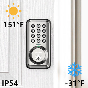 This keypad lock is IP54 waterproof and operates well in temperatures from -31 °F to 151 °F, keeping your home safe in all kinds of climates, including cold winters, hot summers or rainy days.